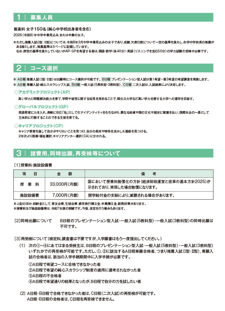 | 入学選考方法 | 書類審査・面接 | 国語・数学(各40分)・ 英語(リスニングを含む50分)の 学力試験各100点満点。 ただしグローバルプロジェクト(GP)の 判定においては、 英語を150点満点とする。 書類審査・面接 |