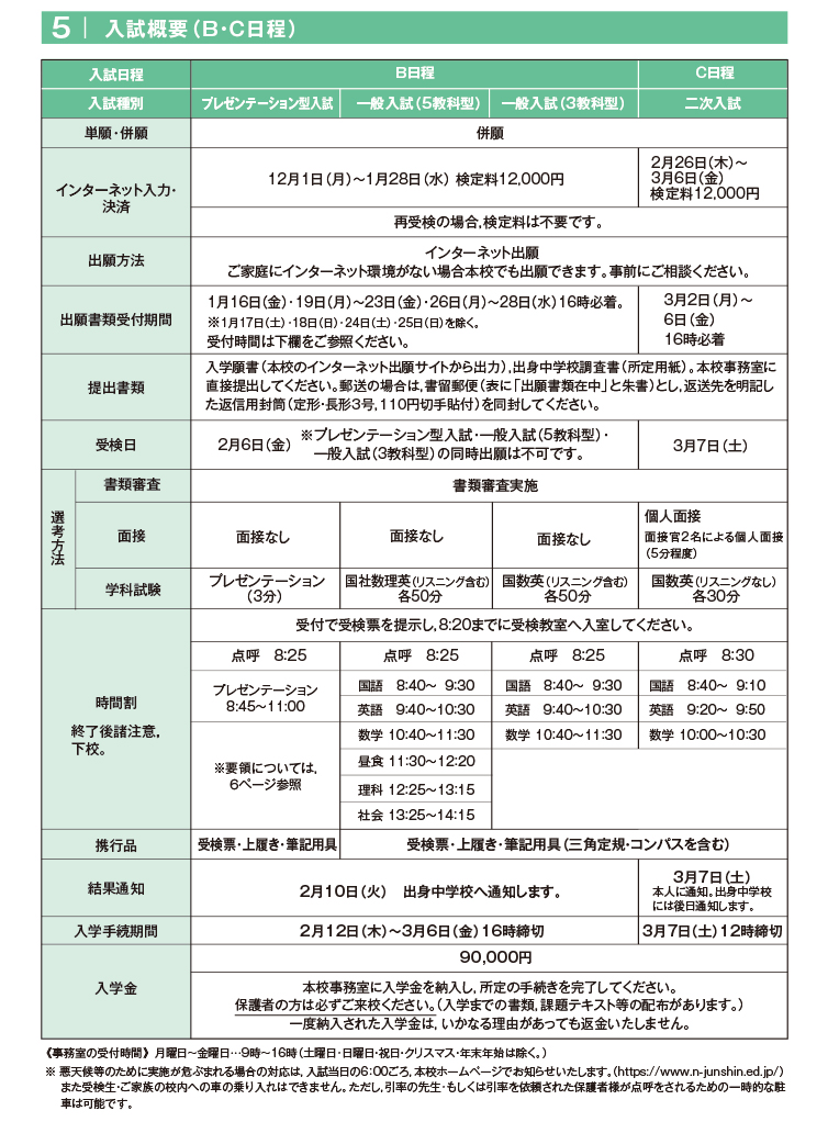 | 入学選考日 | 2月6日(金) ※プレゼンテーション型入試・一般入試(5教科型)・一般入試(3教科型)の同時出願は不可です。 |