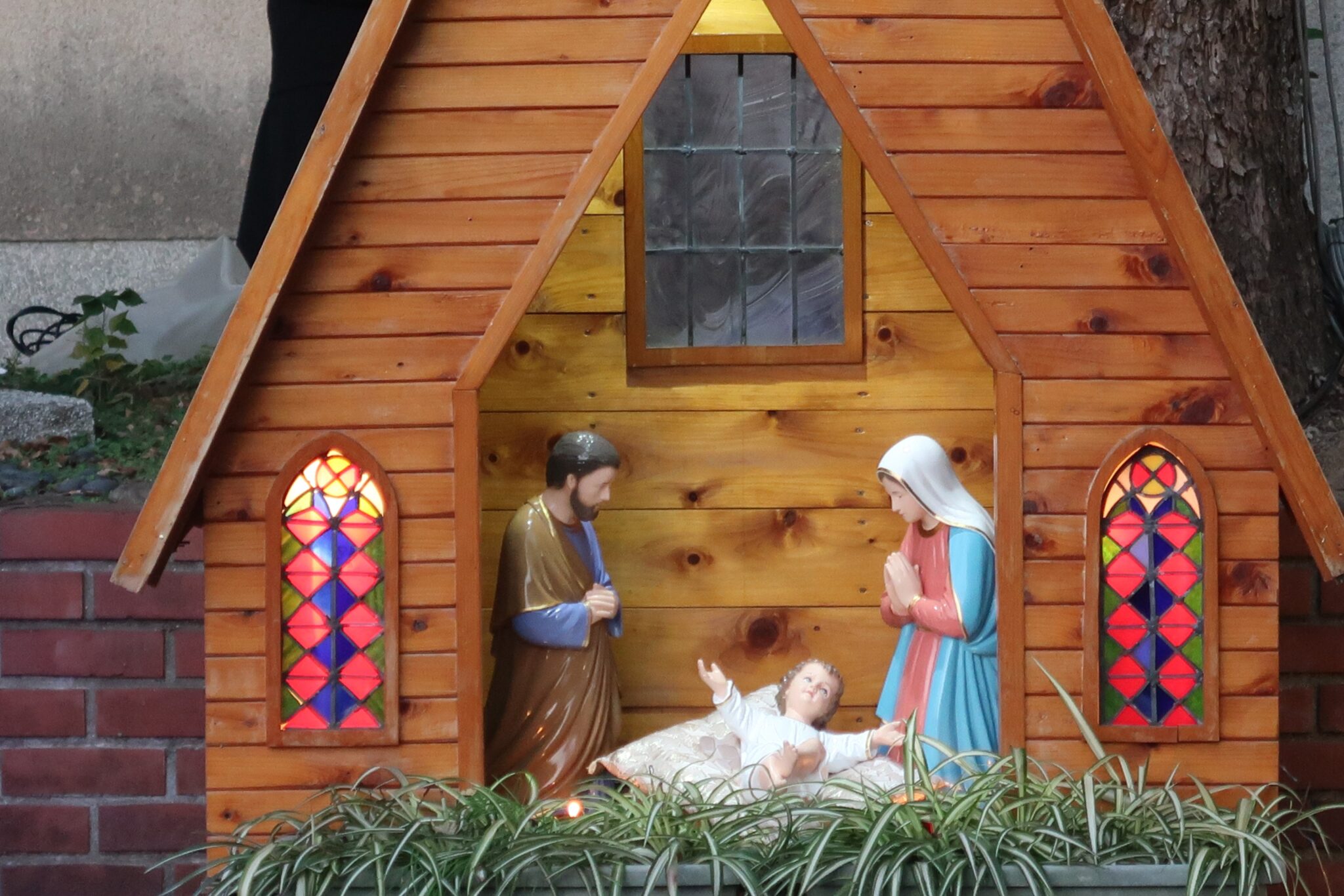 純心幼稚園のみんなと一緒に聖歌を歌い、馬小屋とツリーに光が灯りました。