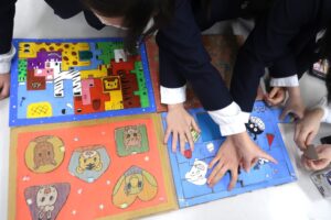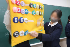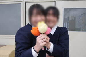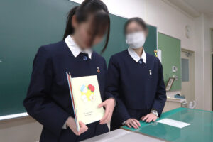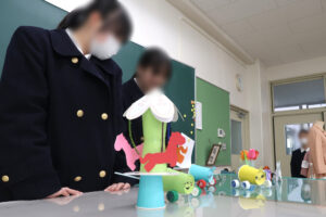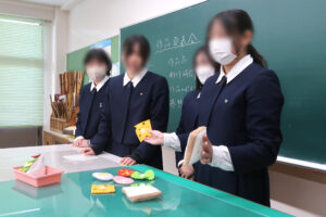 高校3年生が「保育基礎」の授業で絵本やおもちゃなどを作成し、卒業前の最後の授業で作品発表会を行いました。