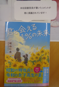 10月になりました。ようやく秋らしい涼しい風が吹くようになってきました。 読書の秋の季節におすすめの1冊をご紹介します。 『君と会える1%の未来』 著者:村山仁志 出版:双葉社 君と会える1%の未来 - 村山仁志 (文庫) | 双葉社 公式 実はこの本の帯に本校の図書委員の生徒の感想が載っています! 長崎にゆかりの深い著者の村山仁志さんの帯ということで、長崎県高等学校文化連盟図書専門部経由お話をいただきました。 参加した図書委員たちは出版前のお話を読み、感想を書かせていただきました。 短期間で1冊分のお話を読み、短い字数で感想を書くという貴重な経験だったと思います。 こういう機会をいただき本当にありがとうございました。![]()